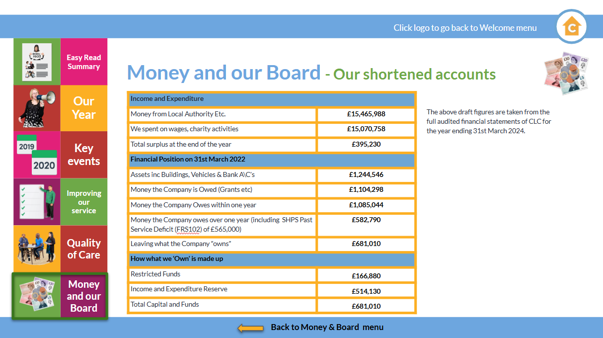 FINAL - CLC Statement of Purpose October 2024-v8These are our latest set of Annual Accounts for the year up to 31st March 2024. This will give you information about the financial performance of the organisation. In the current year our Management Accounts unto December 2024 are showing a surplus of £316,543.