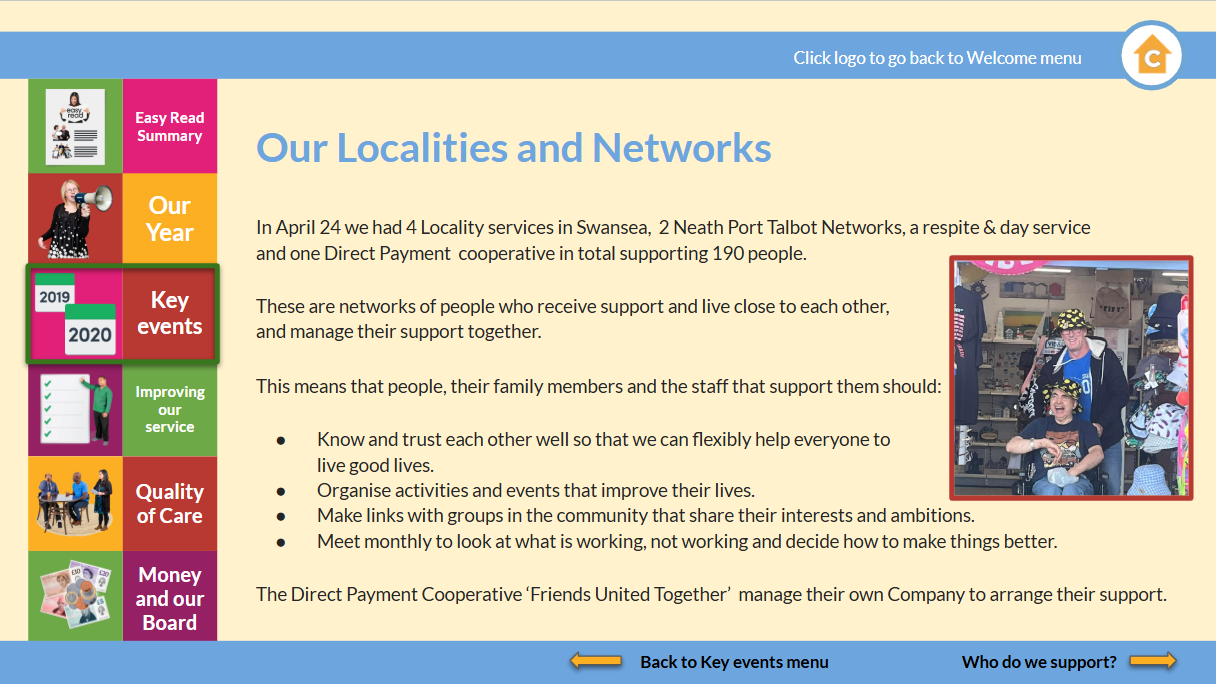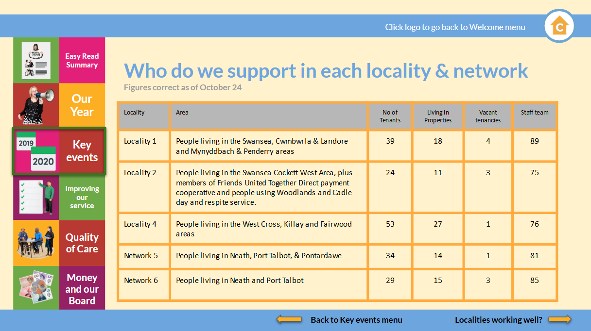 Introducing our Localities and networks - Annual Report Support in our Localities - Annual reportWe are working collaboratively to rethink supported living to mean more than supporting people in their own homes, to being networks of citizens working together in their communities to maximise their wellbeing.